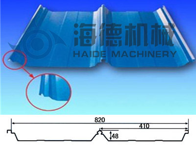 经该机辊轧成型的压型板属咬口屋面板,具有波峰高、强度大、无螺钉锁边咬口安装,搭接安装安全可靠,防水抗台防暴性能强等特点,而且生产自动化程度高,成本低廉,经久耐用,重量轻,拼装组合自由方便。